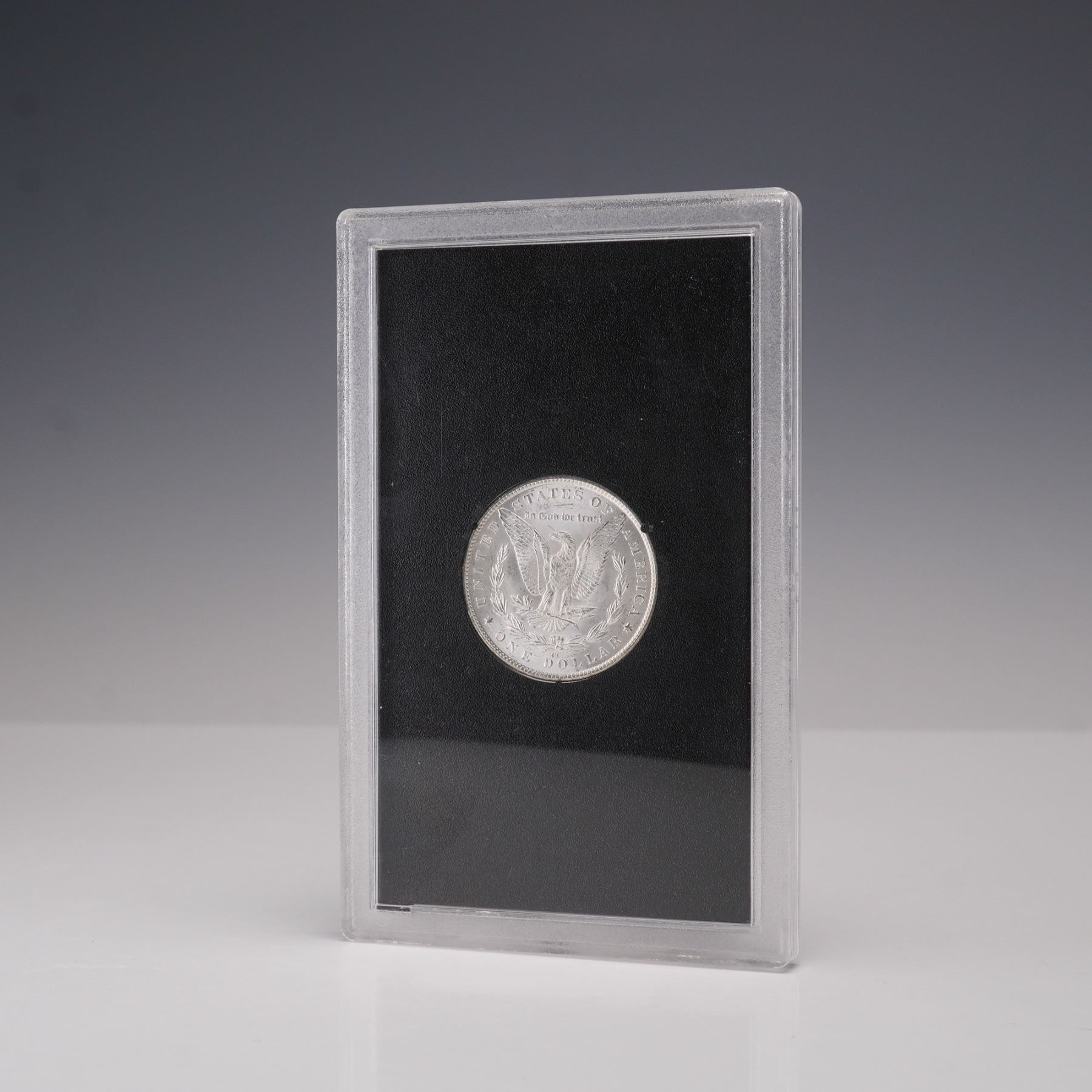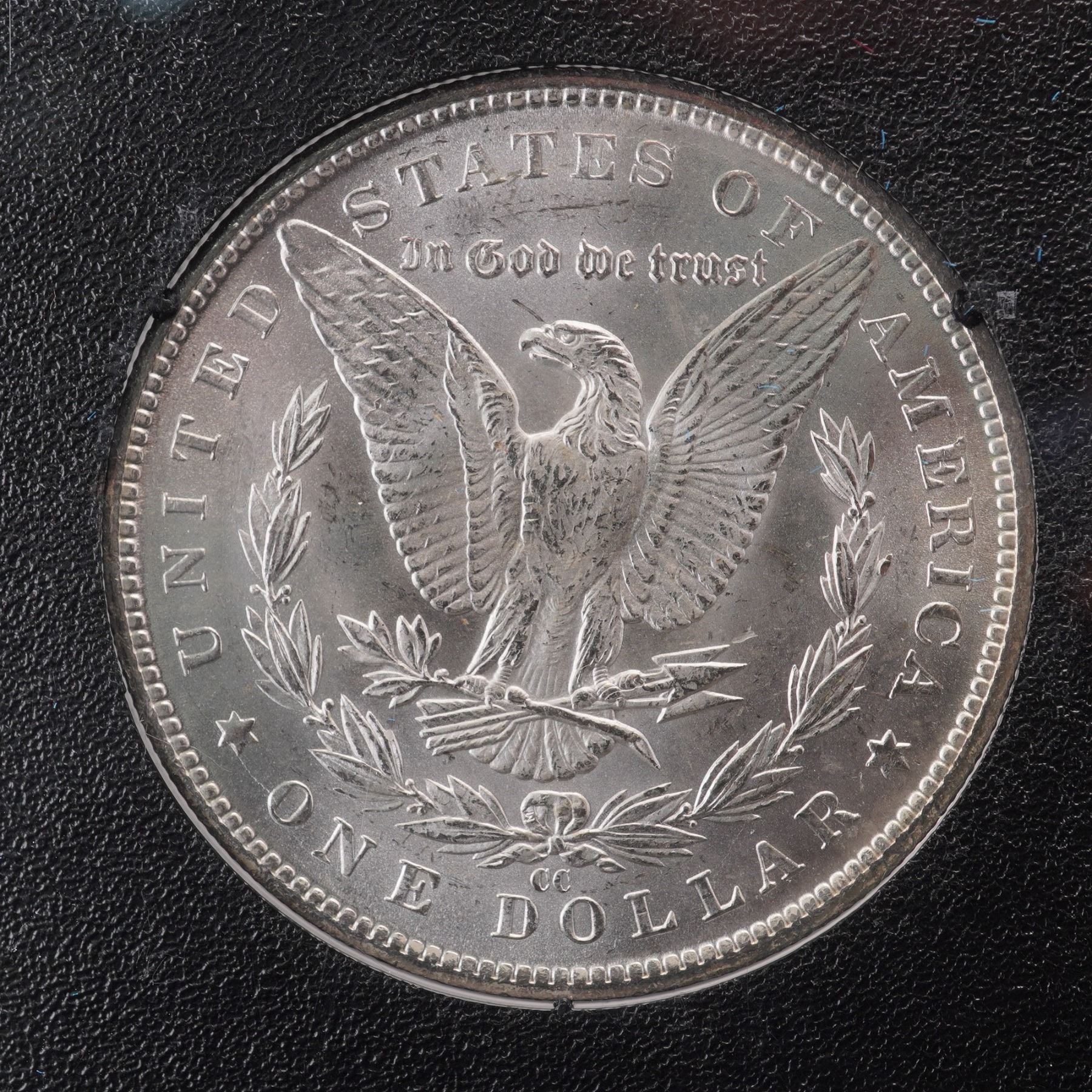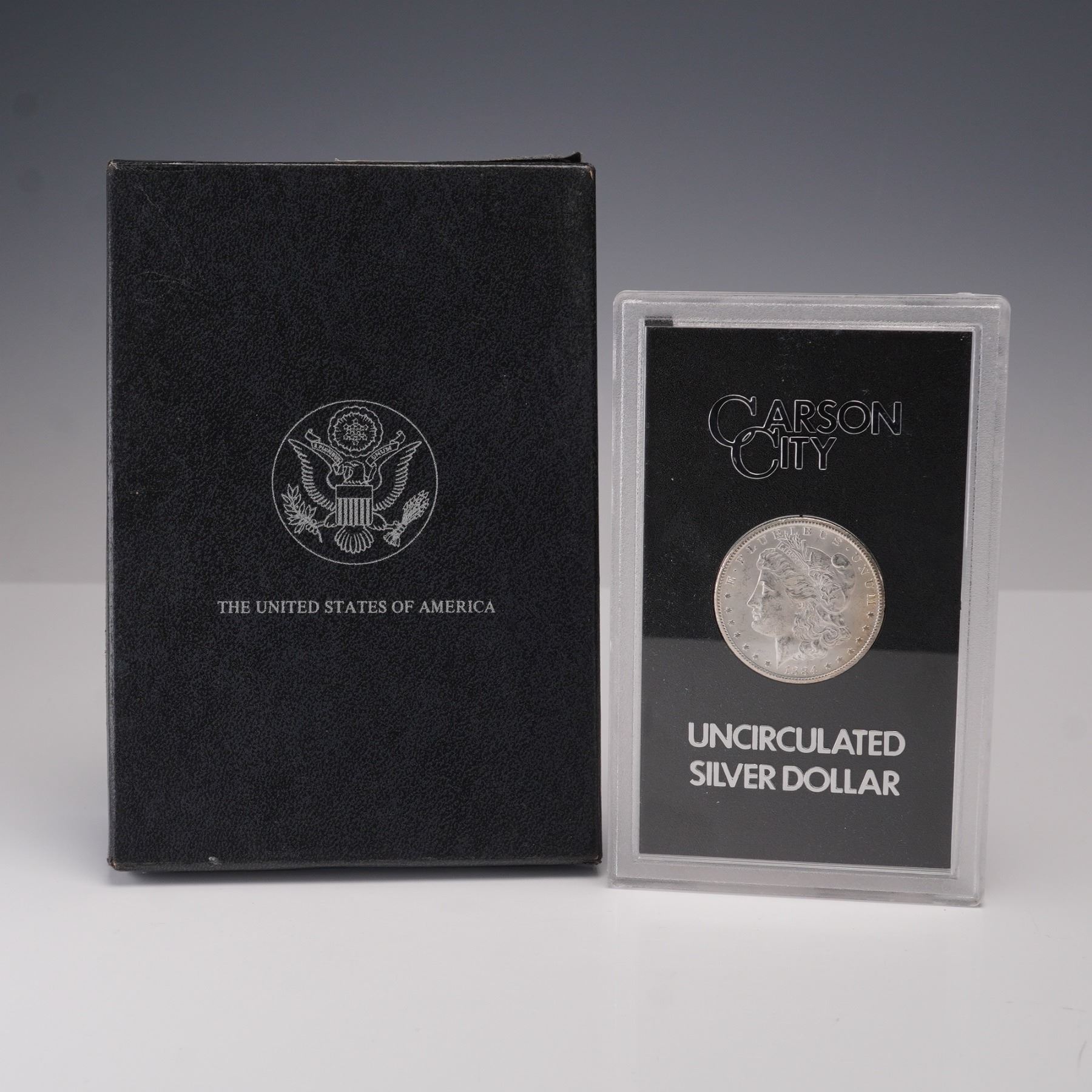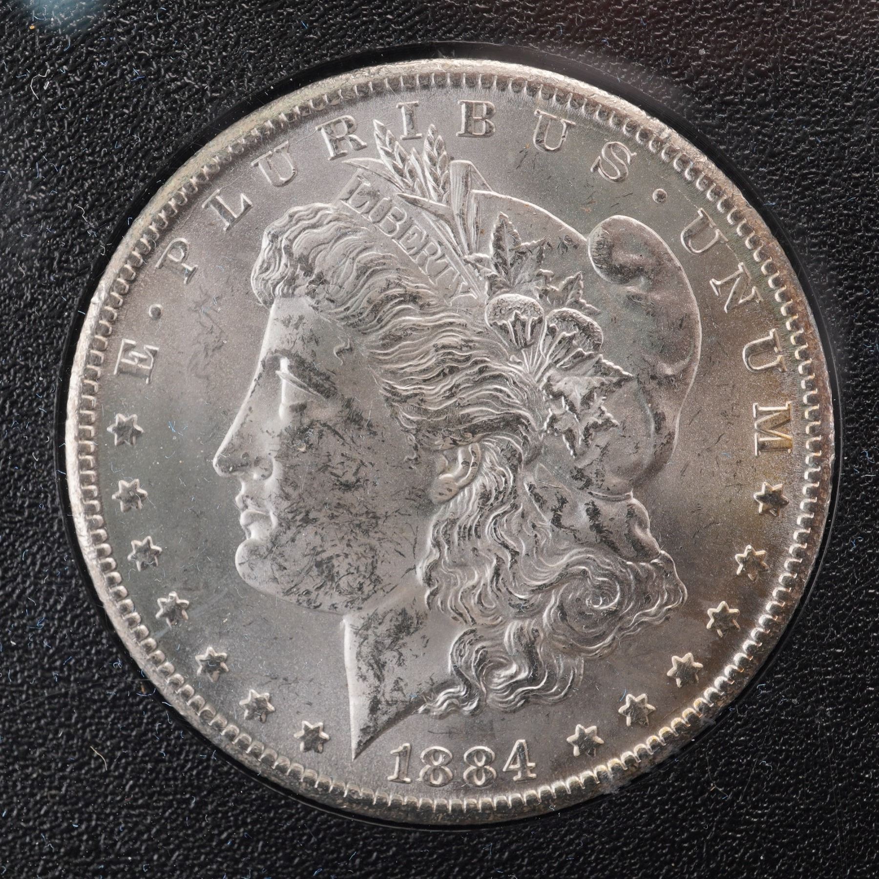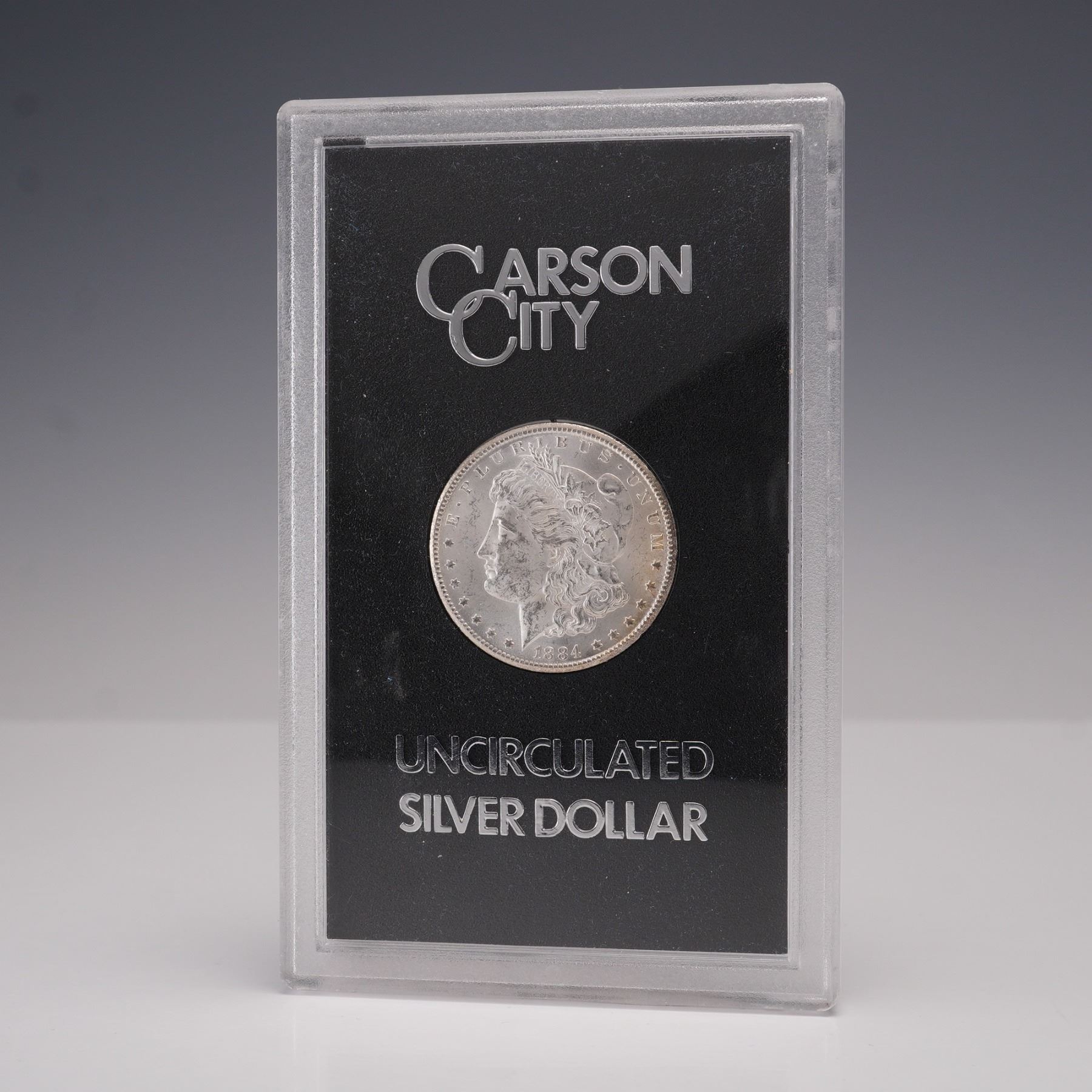 An 1884 Carson City Morgan Silver Dollar presented in an official GSA (General Services Administration) hard plastic display holder marked "Carson City Uncirculated Silver Dollar." The coin bears the iconic left-facing profile of Lady Liberty on the obverse with the date "1884" and thirteen stars below, surrounded by the motto "E Pluribus Unum". The reverse showcases the heraldic eagle with outstretched wings clutching arrows and olive branches, surrounded by the inscriptions United States of America and One Dollar, and includes the "CC" mintmark denoting the historic Carson City Mint. This specimen remains uncirculated and is housed in a holder for further preservation. Slab measures: 3.25"L x 0.25"W x 4.25"H. Coin diameter: 35.02 mm. This item has its original box. Box measures: 4.5"L x 6.5"W x 0.5"H.