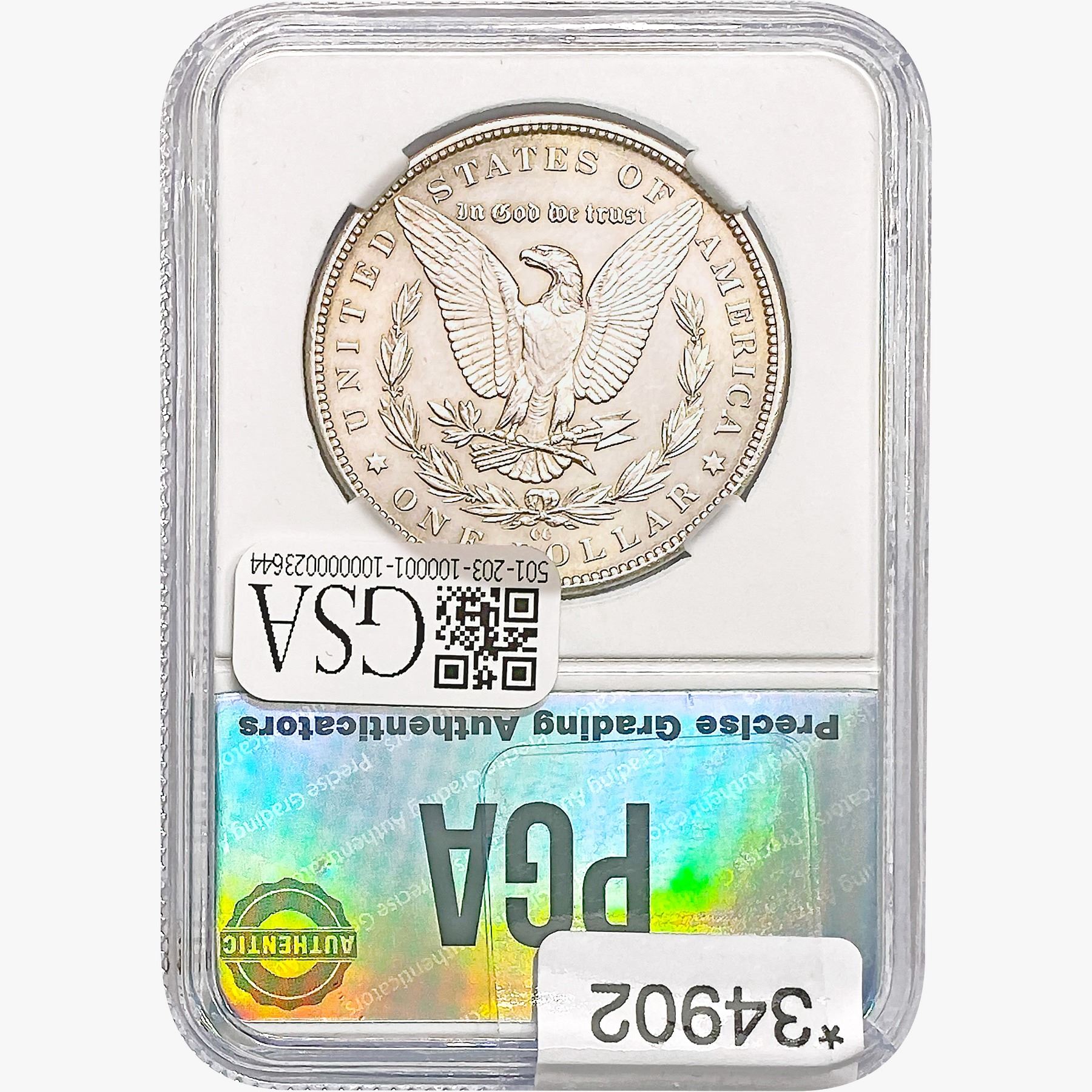 COINS AND CURRENCY LISTED IN GSA’S CATALOG AS GRADED AND ENCAPSULATED BY PCGS, NGC, ANACS, ICG, PCGS CURRENCY, PMG, PCGS BANKNOTE GRADING, CMC OR ANY OTHER THIRD-PARTY GRADING SERVICE ARE LIKEWISE SOLD “AS-IS” EXCEPT AS EXPRESSLY SET FORTH HEREIN. ALL THIRD-PARTY GRADING SERVICE GUARANTEES, INCLUDING AUTHENTICITY, ARE THE SOLE RESPONSIBILITY OF THE THIRD-PARTY GRADING SERVICE AND NOT WARRANTIES OR GUARANTEES OF GSA. BIDDERS SHOULD CONTACT THESE THIRD-PARTY GRADING SERVICES DIRECTLY WITH RESPECT TO ANY CLAIMS OR QUESTIONS THEY MAY HAVE CONCERNING THEIR GUARANTEES AND WARRANTIES. BIDDERS ACKNOWLEDGE AND AGREE THAT AUCTIONEER IS NOT BOUND BY OR LIABLE FOR ANY OPINION OR CERTIFICATION BY ANY THIRD-PARTY GRADING SERVICE. REMOVAL OF A PRODUCT FROM ITS PROTECTIVE CASING OR HOLDER OR ALTERATION OF ANY COIN HOLDER WAIVES ALL RIGHTS CONCERNING THE PRODUCT CONTAINED THEREIN.