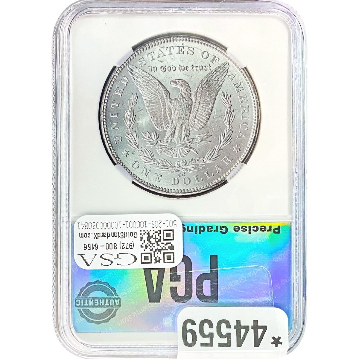 COINS AND CURRENCY LISTED IN GSA’S CATALOG AS GRADED AND ENCAPSULATED BY PCGS, NGC, ANACS, ICG, PCGS CURRENCY, PMG, PCGS BANKNOTE GRADING, CMC OR ANY OTHER THIRD-PARTY GRADING SERVICE ARE LIKEWISE SOLD “AS-IS” EXCEPT AS EXPRESSLY SET FORTH HEREIN. ALL THIRD-PARTY GRADING SERVICE GUARANTEES, INCLUDING AUTHENTICITY, ARE THE SOLE RESPONSIBILITY OF THE THIRD-PARTY GRADING SERVICE AND NOT WARRANTIES OR GUARANTEES OF GSA. BIDDERS SHOULD CONTACT THESE THIRD-PARTY GRADING SERVICES DIRECTLY WITH RESPECT TO ANY CLAIMS OR QUESTIONS THEY MAY HAVE CONCERNING THEIR GUARANTEES AND WARRANTIES. BIDDERS ACKNOWLEDGE AND AGREE THAT AUCTIONEER IS NOT BOUND BY OR LIABLE FOR ANY OPINION OR CERTIFICATION BY ANY THIRD-PARTY GRADING SERVICE. REMOVAL OF A PRODUCT FROM ITS PROTECTIVE CASING OR HOLDER OR ALTERATION OF ANY COIN HOLDER WAIVES ALL RIGHTS CONCERNING THE PRODUCT CONTAINED THEREIN.