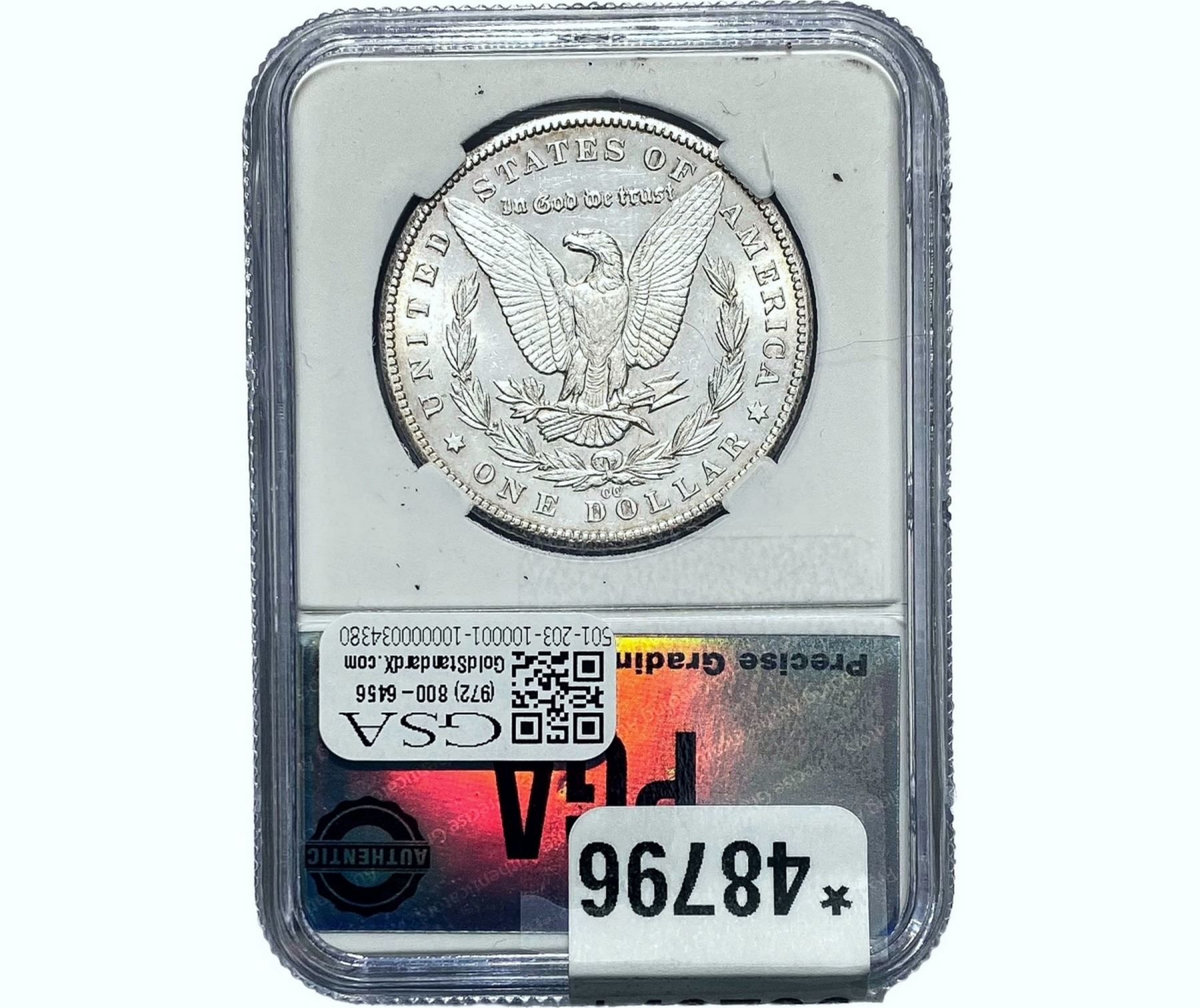 e. Coins sold referencing a third-party grading service are sold “AS IS” without any express or implied warranty, except for a guarantee by GSA that they are genuine. Removal or alteration of the holder, voids all of Bidder’s claims concerning that Product. Certain warranties may be available from the grading services and Bidders are referred to them for further details: Numismatic Guaranty Corporation (NGC), PO Box 4776, Sarasota, FL 34230, www.ngccoin.com/services/writtenguarantee.asp; Professional Coin Grading Services (PCGS), PO Box 9458, Newport Beach, CA 92658, www.pcgs.com/guarantee.html; ANACS, 6555 S. Kenton St., Ste. 303, Englewood, CO 80111; and Independent Coin Grading Co. (ICG), 7901 East Bellview, Ave., Suite 50, Englewood, CO 80111.
