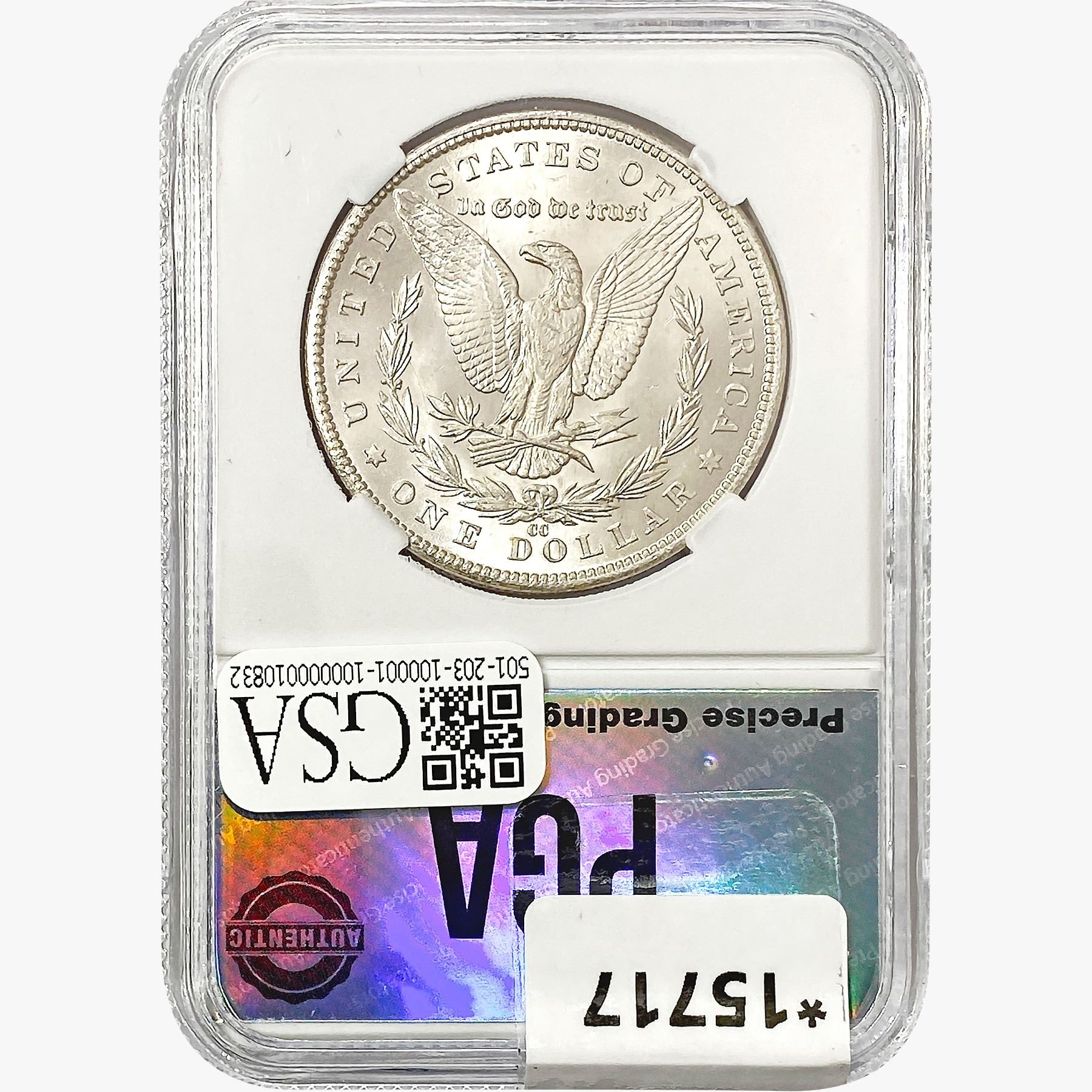 COINS AND CURRENCY LISTED IN GSA’S CATALOG AS GRADED AND ENCAPSULATED BY PCGS, NGC, ANACS, ICG, PCGS CURRENCY, PMG, PCGS BANKNOTE GRADING, CMC OR ANY OTHER THIRD-PARTY GRADING SERVICE ARE LIKEWISE SOLD “AS-IS” EXCEPT AS EXPRESSLY SET FORTH HEREIN. ALL THIRD-PARTY GRADING SERVICE GUARANTEES, INCLUDING AUTHENTICITY, ARE THE SOLE RESPONSIBILITY OF THE THIRD-PARTY GRADING SERVICE AND NOT WARRANTIES OR GUARANTEES OF GSA. BIDDERS SHOULD CONTACT THESE THIRD-PARTY GRADING SERVICES DIRECTLY WITH RESPECT TO ANY CLAIMS OR QUESTIONS THEY MAY HAVE CONCERNING THEIR GUARANTEES AND WARRANTIES. BIDDERS ACKNOWLEDGE AND AGREE THAT AUCTIONEER IS NOT BOUND BY OR LIABLE FOR ANY OPINION OR CERTIFICATION BY ANY THIRD-PARTY GRADING SERVICE. REMOVAL OF A PRODUCT FROM ITS PROTECTIVE CASING OR HOLDER OR ALTERATION OF ANY COIN HOLDER WAIVES ALL RIGHTS CONCERNING THE PRODUCT CONTAINED THEREIN.