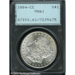 1884-CC S$1 MS61 PCGS. A lustrous, nearly brillian <B>1884-CC S$1 MS61 PCGS.</B></I> A lustrous, nearly brilliant, and nicely struck representative. The reverse is well preserved, although a pinscratch on the chin limits the grade. Certified in a first generation holder. <BR><BR><B>Important notice:</B> Heritage usually auctions material at the rate of 200-250 lots per hour. On some occasions eBay Live bid software or the Internet may not be able to keep up with the pace of the auction. We recommend placing a realistic absentee bid now as insurance to avoid disappointment. Occasionally the auctioneer may eliminate or reject an eBay Live bid, and the auctioneer may also reopen a lot after the close of the eBay live bidding (usually because we missed an audience bid), and may reject your bid even if it shows you as the winning bidder. By bidding via eBay Live, you agree that Heritage may award the lot to another bidder at its sole discretion under the circumstances described above or any other reasonable circumstances. Since eBay bids are not shown to us until we open the lot on the floor, we treat those bids just like floor bids. In most cases the floor responds before the eBay bid is presented to us, due to Internet lag time, so for consistency we have made it a policy that floor bids are always considered first over tie eBay live bids. Also please note that all Heritage lots purchased through eBay Live carry a 20% Buyer's Premium. Please make sure you read the Terms and Conditions before you bid. This lot is being auctioned in conjunction with a live floor auction by Heritage Galleries & Auctioneers. All final auction and invoice information will be supplied by Heritage Galleries & Auctioneers, and all other information should be considered preliminary. Lot:7463