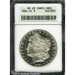 1884-CC S$1 MS63 Cameo Deep Mirror Prooflike ANACS. <B>1884-CC S$1 MS63 Cameo Deep Mirror Prooflike ANACS.</B></I> Exceptional white on black contrast and spectacularly mirrored fields ensure the eye appeal of this crisply struck Silver Dollar. The flashy fields are unmarked, although the cheek has a few minor grazes. <BR><BR><B>Important notice:</B> Heritage usually auctions material at the rate of 200-250 lots per hour. On some occasions eBay Live bid software or the Internet may not be able to keep up with the pace of the auction. We recommend placing a realistic absentee bid now as insurance to avoid disappointment. Occasionally the auctioneer may eliminate or reject an eBay Live bid, and the auctioneer may also reopen a lot after the close of the eBay live bidding (usually because we missed an audience bid), and may reject your bid even if it shows you as the winning bidder. By bidding via eBay Live, you agree that Heritage may award the lot to another bidder at its sole discretion under the circumstances described above or any other reasonable circumstances. Since eBay bids are not shown to us until we open the lot on the floor, we treat those bids just like floor bids. In most cases the floor responds before the eBay bid is presented to us, due to Internet lag time, so for consistency we have made it a policy that floor bids are always considered first over tie eBay live bids. Also please note that all Heritage lots purchased through eBay Live carry a 20% Buyer's Premium. Please make sure you read the Terms and Conditions before you bid. This lot is being auctioned in conjunction with a live floor auction by Heritage Galleries & Auctioneers. All final auction and invoice information will be supplied by Heritage Galleries & Auctioneers, and all other information should be considered preliminary. Lot:7481