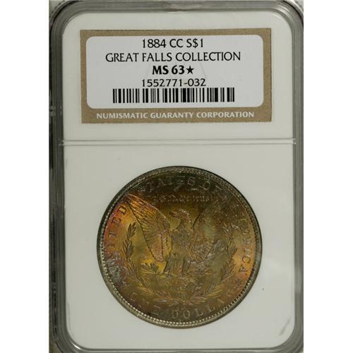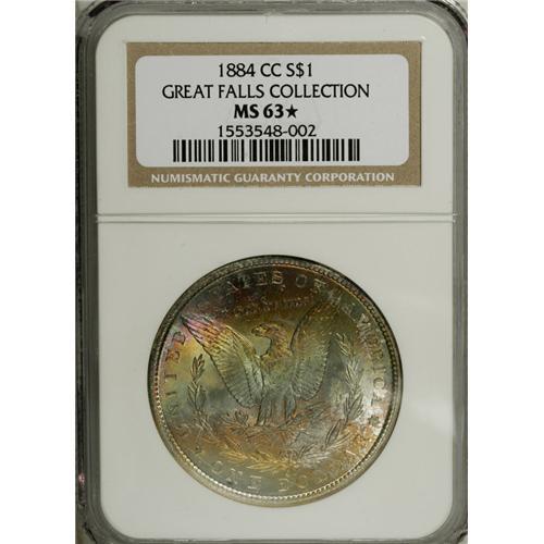 <B>1884-CC S$1 MS63 <img border='0' src='http://www.heritagecoins.com/images/star.gif' width=10 height=10> NGC,</B></I> two pieces, each highly lustrous and suitably struck. The first has zones of mauve, gold, and magenta on the reverse with a crescent of orange-gold and magenta at the lower obverse, while the second has red-tinged orange over the reverse with lemon peripheral toning on the other side.<BR><I>From The Great Falls Collection.</B></I><BR><BR><b>Shipping:</b> Coins & Currency (<a target="_blank" href="http://www.heritageauctions.com/common/shipping.php">view shipping information</a>)