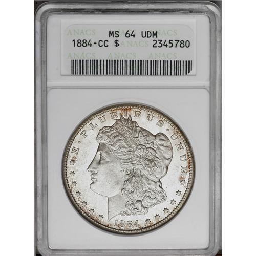 <B>1884-CC<img border='0' src='http://www.heritagecoins.com/images/star.gif' width=10 height=10>$1> MS64 Deep Mirror Prooflike ANACS.</B></I> Certified as an Ultra Deep Mirror Prooflike by ANACS. Although the fields and devices are lightly abraded, this near-Gem example has exceptional eye appeal. Both sides are fully brilliant with a touch of light gold color near the borders.