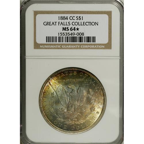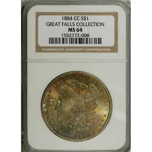 <B>1884-CC S$1 MS64 NGC,</B></I> richly toned orange and magenta on the obverse with a creamy silver-gray reverse; and an <B>1884-CC S$1 MS64 <img border='0' src='http://www.heritagecoins.com/images/star.gif' width=10 height=10> NGC,</B></I> frosty and crisply struck with bands of salmon-peach, gold, mint-green, and orange patina.<BR><I>From The Great Falls Collection.</B></I><BR><BR><b>Shipping:</b> Coins & Currency (<a target="_blank" href="http://www.heritageauctions.com/common/shipping.php">view shipping information</a>)
