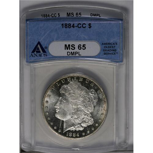 <B>1884-CC<img border='0' src='http://www.heritagecoins.com/images/star.gif' width=10 height=10>$1> MS65 Deep Mirror Prooflike ANACS.</B></I> A few milky patches cover otherwise untoned and intense mirrors and slightly frosted devices. A sharp Carson City Gem.