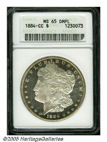 <B>1884-CC<S$1> MS65 Deep Mirror Prooflike ANACS.</B></I> Particularly striking example, especially the obverse, with deep contrast. Some golden tonality is noted, especially in the peripheries and on the upper reverse where it takes on a matte quality. Well preserved, as expected, with reasonably few of the typical abrasions.