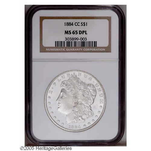 <B>1884-CC<S$1> MS65 Deep Mirror Prooflike NGC.</B></I> Stark white-on-black contrast is evident on each side of this well struck Gem. The richly frosted devices are snow-white over jet-black fields. Minimally abraded, as expected for the MS65 grade level. A beautiful, deeply Prooflike silver dollar.