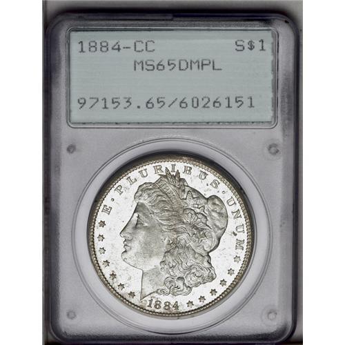 <B>1884-CC<img border='0' src='http://www.heritagecoins.com/images/star.gif' width=10 height=10>$1> MS65 Deep Mirror Prooflike PCGS.</B></I> Deep mirrored fields are nearly pristine, with a high degree of contrast against the frosty motifs, that are sharply defined throughout. Some minor luster grazes on Liberty's cheek and neck and on the eagle's breast do not distract in the least. Housed in a first generation PCGS holder.