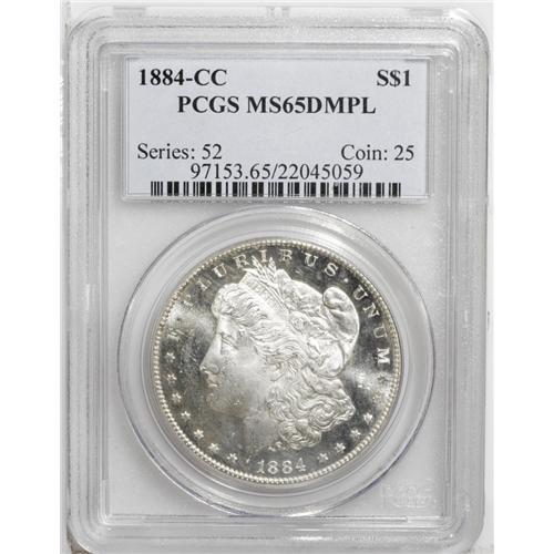 <B>1884-CC<img border='0' src='http://www.heritagecoins.com/images/star.gif' width=10 height=10>$1> MS65 Deep Mirror Prooflike PCGS.</B></I> Deeply frosted devices, highlighted by prooflike fields that define black and white contrast quite eloquently.