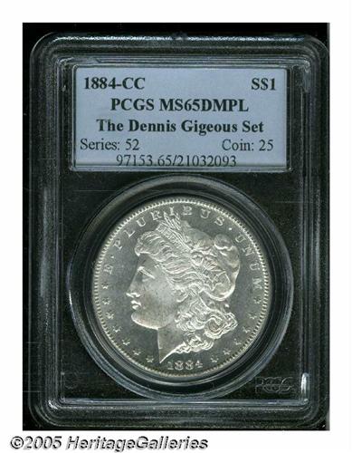 <B>1884-CC<S$1> MS65 Deep Mirror Prooflike PCGS.</B></I> Ex: The Dennis Gigeous Set. A lightly toned and prominently mirrored Gem, not far from brilliant, and void of consequential marks. The devices demonstrate moderate contrast with the flashy fields.