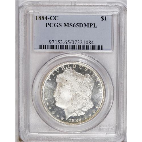 <B>1884-CC<img border='0' src='http://www.heritagecoins.com/images/star.gif' width=10 height=10>$1> MS65 Deep Mirror Prooflike PCGS.</B></I> Thick, luxurious mint frost covers the devices, and the watery mirrors have unfathomable depth. A few small abrasions in unobtrusive areas keep this Gem from a higher grade.<BR><I>From The New York Eye Appeal Collection.</B></I>