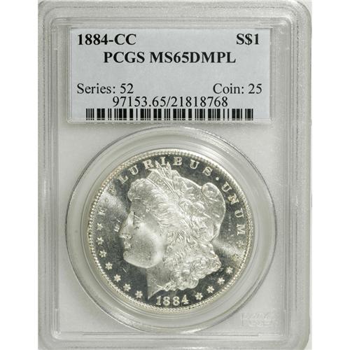 <B>1884-CC S$1 MS65 Deep Mirror Prooflike PCGS.</B></I> Icy devices and flashy mirrored fields ensure remarkable eye appeal. A well struck and attractively preserved Gem. The '84-CC is familiar because of the GSA hoard, but high grade DMPL examples are elusive.<BR><BR><b>Shipping:</b> Coins & Currency (<a target="_blank" href="http://www.heritageauctions.com/common/shipping.php">view shipping information</a>)