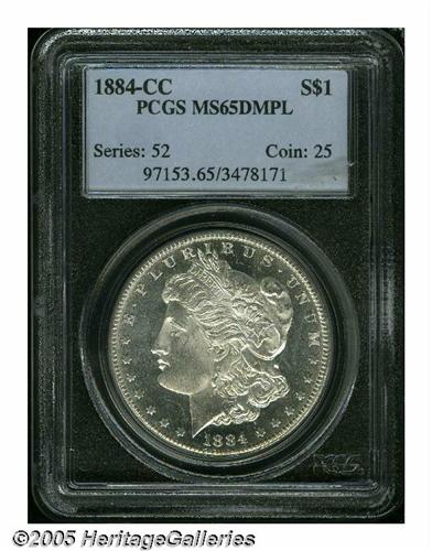<B>1884-CC<S$1> MS65 Deep Mirror Prooflike PCGS.</B></I> This crisply struck Gem is nearly untoned, save for a wisp of light color on Liberty's cheek. The deeply mirrored fields present a nice contrast with the motifs, and the surfaces are devoid of any significant abrasions. Sharp overall appearance.