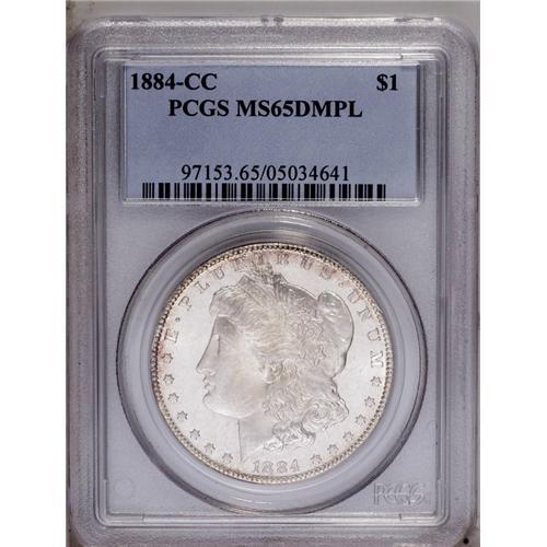 <B>1884-CC<img border='0' src='http://www.heritagecoins.com/images/star.gif' width=10 height=10>$1> MS65 Deep Mirror Prooflike PCGS.</B></I> Blushes of tobacco-brown toning grace the borders of this magnificently mirrored and acceptably preserved Gem. The strike is good if not quite fully brought up in the centers.