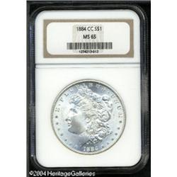 1884-CC S$1 MS65 NGC. A virtually brilliant Gem th <B>1884-CC S$1 MS65 NGC.</B></I> A virtually brilliant Gem that features blazing cartwheel luster and a bold strike. An exceptionally preserved Carson City Dollar. <BR><BR><B>Important notice:</B> Heritage usually auctions material at the rate of 200-250 lots per hour. On some occasions eBay Live bid software or the Internet may not be able to keep up with the pace of the auction. We recommend placing a realistic absentee bid now as insurance to avoid disappointment. Occasionally the auctioneer may eliminate or reject an eBay Live bid, and the auctioneer may also reopen a lot after the close of the eBay live bidding (usually because we missed an audience bid), and may reject your bid even if it shows you as the winning bidder. By bidding via eBay Live, you agree that Heritage may award the lot to another bidder at its sole discretion under the circumstances described above or any other reasonable circumstances. Since eBay bids are not shown to us until we open the lot on the floor, we treat those bids just like floor bids. In most cases the floor responds before the eBay bid is presented to us, due to Internet lag time, so for consistency we have made it a policy that floor bids are always considered first over tie eBay live bids. Also please note that all Heritage lots purchased through eBay Live carry a 20% Buyer's Premium. Please make sure you read the Terms and Conditions before you bid. This lot is being auctioned in conjunction with a live floor auction by Heritage Galleries & Auctioneers. All final auction and invoice information will be supplied by Heritage Galleries & Auctioneers, and all other information should be considered preliminary. Lot:7466