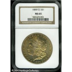 1884-CC S$1 MS65 NGC. Golden-yellow toning occupie <B>1884-CC S$1 MS65 NGC.</B></I> Golden-yellow toning occupies the obverse, while the reverse is nearly untoned. Sharply struck motifs, and virtually devoid of any significant marks. <BR><BR><B>Important notice:</B> Heritage usually auctions material at the rate of 200-250 lots per hour. On some occasions eBay Live bid software or the Internet may not be able to keep up with the pace of the auction. We recommend placing a realistic absentee bid now as insurance to avoid disappointment. Occasionally the auctioneer may eliminate or reject an eBay Live bid, and the auctioneer may also reopen a lot after the close of the eBay live bidding (usually because we missed an audience bid), and may reject your bid even if it shows you as the winning bidder. By bidding via eBay Live, you agree that Heritage may award the lot to another bidder at its sole discretion under the circumstances described above or any other reasonable circumstances. Since eBay bids are not shown to us until we open the lot on the floor, we treat those bids just like floor bids. In most cases the floor responds before the eBay bid is presented to us, due to Internet lag time, so for consistency we have made it a policy that floor bids are always considered first over tie eBay live bids. Also please note that all Heritage lots purchased through eBay Live carry a 20% Buyer's Premium. Please make sure you read the Terms and Conditions before you bid. This lot is being auctioned in conjunction with a live floor auction by Heritage Galleries & Auctioneers. All final auction and invoice information will be supplied by Heritage Galleries & Auctioneers, and all other information should be considered preliminary. Lot:7468