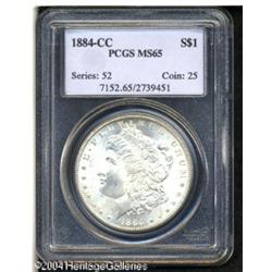 1884-CC S$1 MS65 PCGS. Light gold color graces thi <B>1884-CC S$1 MS65 PCGS.</B></I> Light gold color graces this boldly struck and attractively preserved Gem. A popular Carson City issue. <BR><BR><B>Important notice:</B> Heritage usually auctions material at the rate of 200-250 lots per hour. On some occasions eBay Live bid software or the Internet may not be able to keep up with the pace of the auction. We recommend placing a realistic absentee bid now as insurance to avoid disappointment. Occasionally the auctioneer may eliminate or reject an eBay Live bid, and the auctioneer may also reopen a lot after the close of the eBay live bidding (usually because we missed an audience bid), and may reject your bid even if it shows you as the winning bidder. By bidding via eBay Live, you agree that Heritage may award the lot to another bidder at its sole discretion under the circumstances described above or any other reasonable circumstances. Since eBay bids are not shown to us until we open the lot on the floor, we treat those bids just like floor bids. In most cases the floor responds before the eBay bid is presented to us, due to Internet lag time, so for consistency we have made it a policy that floor bids are always considered first over tie eBay live bids. Also please note that all Heritage lots purchased through eBay Live carry a 20% Buyer's Premium. Please make sure you read the Terms and Conditions before you bid. This lot is being auctioned in conjunction with a live floor auction by Heritage Galleries & Auctioneers. All final auction and invoice information will be supplied by Heritage Galleries & Auctioneers, and all other information should be considered preliminary. Lot:7469