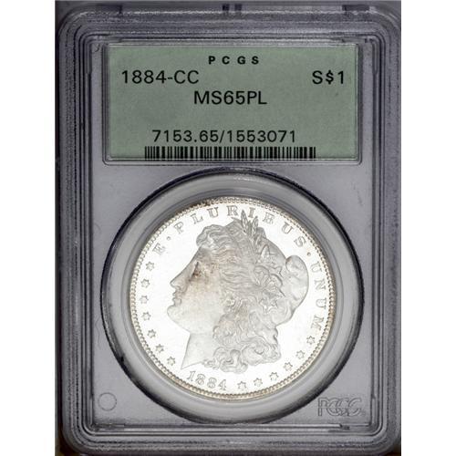 <B>1884-CC<img border='0' src='http://www.heritagecoins.com/images/star.gif' width=10 height=10>$1> MS65 Prooflike PCGS.</B></I> Marvelous prooflike fields highlight frosted motifs, yielding a cameo-like effect that jumps out at the viewer from all angles. Speckles of russet gather around Liberty's eye and temple, otherwise the coin remains essentially untoned. Exquisite definition is apparent on the design elements, including virtually full delineation in the hair over Liberty's ear. A few minor luster grazes here and there are all that prevent a higher grade. A tiny toning spot on the last T in TRUST is mentioned for accuracy. <BR><BR><B>Important notice:</B> Heritage usually auctions material at the rate of 200-250 lots per hour. On some occasions eBay Live bid software or the Internet may not be able to keep up with the pace of the auction. We recommend placing a realistic absentee bid now as insurance to avoid disappointment. Occasionally the auctioneer may eliminate or reject an eBay Live bid, and the auctioneer may also reopen a lot after the close of the eBay live bidding (usually because we missed an audience bid), and may reject your bid even if it shows you as the winning bidder. By bidding via eBay Live, you agree that Heritage may award the lot to another bidder at its sole discretion under the circumstances described above or any other reasonable circumstances. Since eBay bids are not shown to us until we open the lot on the floor, we treat those bids just like floor bids. In most cases the floor responds before the eBay bid is presented to us, due to Internet lag time, so for consistency we have made it a policy that floor bids are always considered first over tie eBay live bids. Also please note that all Heritage lots purchased through eBay Live carry a 20% Buyer's Premium. Please make sure you read the Terms and Conditions before you bid. This lot is being auctioned in conjunction with a live floor auction by Heritage Galleries & Auctioneers. All final auction and invoice information will be supplied by Heritage Galleries & Auctioneers, and all other information should be considered preliminary. Lot:3397 <BR><BR><B>Winning Notification and Billing:</B> After the FINAL session in this auction is complete, Heritage will send e-mail and snail mail invoices. This process normally takes several days. All final auction and invoice information will be supplied by Heritage Galleries & Auctioneers, and all other information should be considered preliminary. <BR><BR>This auction will be conducted on a live auction floor and over the Internet through eBay Live. If you choose to place an absentee bid, please take a moment to <font color='#0000ff'><u><a href='http://pages.ebay.com/liveauctions/help/before/laabsentee.html'>learn how eBay Live absentee bidding works</a></u></font><font color='#000000'>