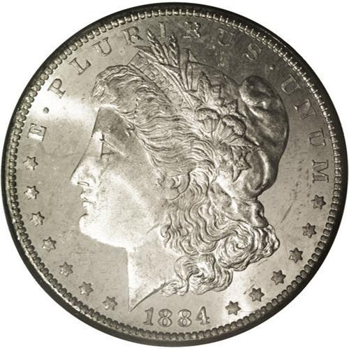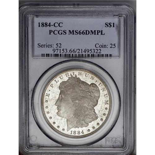 <B>1884-CC<img border='0' src='http://www.heritagecoins.com/images/star.gif' width=10 height=10>$1> MS66 Deep Mirror Prooflike PCGS.</B></I> Among Morgan dollars coined at the Carson City Mint, this date is the most plentiful in Mint State condition. However, examples with deeply mirrored fields, such as this one, are highly elusive. Only 8% of the 1884-CC Morgan dollars graded by PCGS carry the DMPL designation. Both sides of this beauty are fully brilliant with highly lustrous devices, imparting exceptional Cameo contrast. It is a remarkable example that approaches the finest available quality for a DMPL representative of the date. Population: 99 in 66, 3 finer (4/06).
