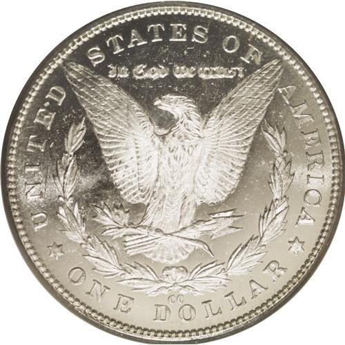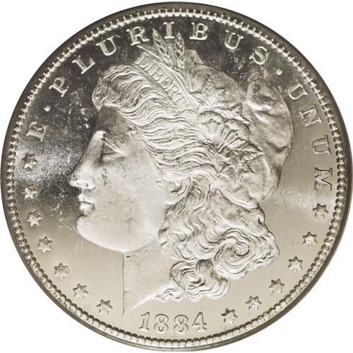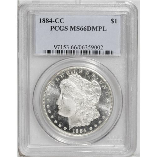<B>1884-CC<img border='0' src='http://www.heritagecoins.com/images/star.gif' width=10 height=10>$1> MS66 Deep Mirror Prooflike PCGS.</B></I> Stunning white-on-black contrast radiates forth from the frosty, brilliant surfaces of this exquisitely struck Premium Gem. Liberty's cheek is especially clean, and there are only a few scattered field blemishes on either side of the piece. A truly marvelous Deep Mirror Prooflike silver dollar from the Carson City Mint. Only three pieces have been graded finer by PCGS (7/06).