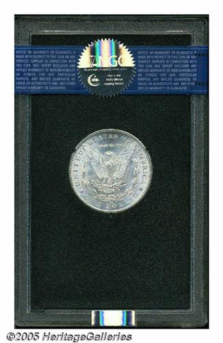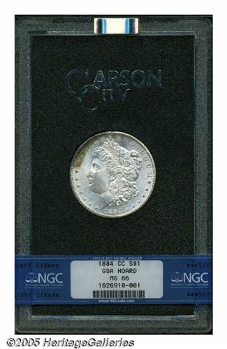 <B>1884-CC<S$1> MS66 NGC.</B></I> An arc of forest-green, ruby-red, and honey color enriches the upper left obverse border, although this lustrous premium Gem is otherwise close to brilliant. A splendidly smooth CC-mint Dollar.