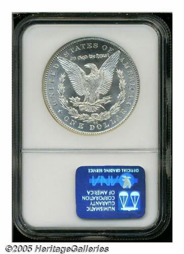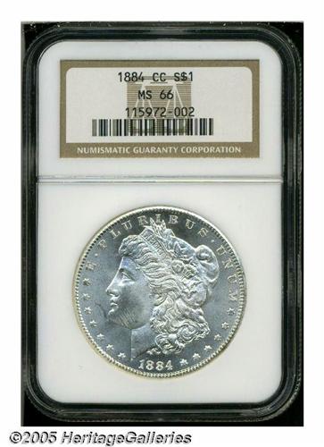 <B>1884-CC<S$1> MS66 NGC.</B></I> Bright lustrous surfaces adorn each side of this CC dollar. Virtually untoned, with sharply struck design elements, and semi-prooflike fields. Some light contact marks and scuffs are noted on Liberty's cheek and neck, and in the left (facing) obverse field. NGC has certified only 47 specimens finer (5/05).