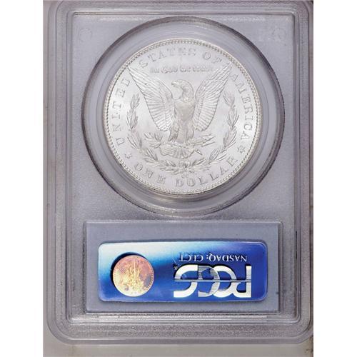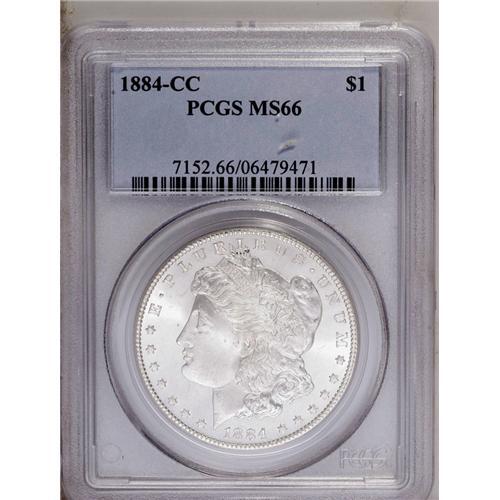 <B>1884-CC<img border='0' src='http://www.heritagecoins.com/images/star.gif' width=10 height=10>$1> MS66 PCGS.</B></I> A flashy and brilliant example with light frost on the boldly struck devices. The fields have some reflectivity, though not enough to qualify as prooflike.
