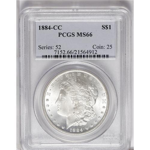 <B>1884-CC<img border='0' src='http://www.heritagecoins.com/images/star.gif' width=10 height=10>$1> MS66 PCGS.</B></I> A frosty and mostly untoned Premium Gem that has excellent detail. Thin rose-lilac patina appears on Liberty's cheek and on the eagle.