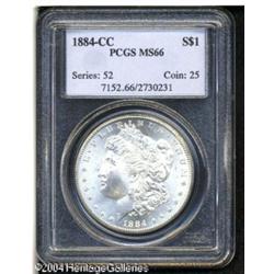 1884-CC S$1 MS66 PCGS. A trace of gold color denie <B>1884-CC S$1 MS66 PCGS.</B></I> A trace of gold color denies full brilliance. An intricately struck and lustrous premium Gem that has outstanding preservation. <BR><BR><B>Important notice:</B> Heritage usually auctions material at the rate of 200-250 lots per hour. On some occasions eBay Live bid software or the Internet may not be able to keep up with the pace of the auction. We recommend placing a realistic absentee bid now as insurance to avoid disappointment. Occasionally the auctioneer may eliminate or reject an eBay Live bid, and the auctioneer may also reopen a lot after the close of the eBay live bidding (usually because we missed an audience bid), and may reject your bid even if it shows you as the winning bidder. By bidding via eBay Live, you agree that Heritage may award the lot to another bidder at its sole discretion under the circumstances described above or any other reasonable circumstances. Since eBay bids are not shown to us until we open the lot on the floor, we treat those bids just like floor bids. In most cases the floor responds before the eBay bid is presented to us, due to Internet lag time, so for consistency we have made it a policy that floor bids are always considered first over tie eBay live bids. Also please note that all Heritage lots purchased through eBay Live carry a 20% Buyer's Premium. Please make sure you read the Terms and Conditions before you bid. This lot is being auctioned in conjunction with a live floor auction by Heritage Galleries & Auctioneers. All final auction and invoice information will be supplied by Heritage Galleries & Auctioneers, and all other information should be considered preliminary. Lot:7476