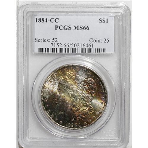<B>1884-CC<img border='0' src='http://www.heritagecoins.com/images/star.gif' width=10 height=10>$1> MS66 PCGS.</B></I> An outstanding and highly colorful example with mottled rainbow toning on the obverse. The reverse is fully brilliant. This sharply struck dollar has underlying frosty mint luster and nearly pristine surfaces.