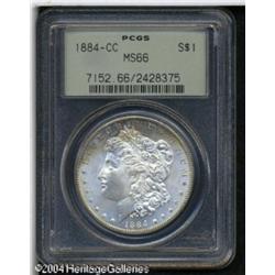 1884-CC S$1 MS66 PCGS. Powder-blue, rose, and oran <B>1884-CC S$1 MS66 PCGS.</B></I> Powder-blue, rose, and orange colors enrich the upper obverse periphery. A needle-sharp example, the reverse field is immaculate and the remainder of the surfaces are also splendidly preserved. <BR><BR><B>Important notice:</B> Heritage usually auctions material at the rate of 200-250 lots per hour. On some occasions eBay Live bid software or the Internet may not be able to keep up with the pace of the auction. We recommend placing a realistic absentee bid now as insurance to avoid disappointment. Occasionally the auctioneer may eliminate or reject an eBay Live bid, and the auctioneer may also reopen a lot after the close of the eBay live bidding (usually because we missed an audience bid), and may reject your bid even if it shows you as the winning bidder. By bidding via eBay Live, you agree that Heritage may award the lot to another bidder at its sole discretion under the circumstances described above or any other reasonable circumstances. Since eBay bids are not shown to us until we open the lot on the floor, we treat those bids just like floor bids. In most cases the floor responds before the eBay bid is presented to us, due to Internet lag time, so for consistency we have made it a policy that floor bids are always considered first over tie eBay live bids. Also please note that all Heritage lots purchased through eBay Live carry a 20% Buyer's Premium. Please make sure you read the Terms and Conditions before you bid. This lot is being auctioned in conjunction with a live floor auction by Heritage Galleries & Auctioneers. All final auction and invoice information will be supplied by Heritage Galleries & Auctioneers, and all other information should be considered preliminary. Lot:7477