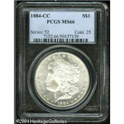 1884-CC S$1 MS66 PCGS. The fields are nearly proof <B>1884-CC S$1 MS66 PCGS.</B></I> The fields are nearly prooflike, especially on the reverse, and offer a mild contrast with the motifs. The design elements are crisply struck, and the virtually untoned surfaces appear to be devoid of any significant marks. A flashy looking Morgan dollar! <BR><BR><B>Important notice:</B> Heritage usually auctions material at the rate of 200-250 lots per hour. On some occasions eBay Live bid software or the Internet may not be able to keep up with the pace of the auction. We recommend placing a realistic absentee bid now as insurance to avoid disappointment. Occasionally the auctioneer may eliminate or reject an eBay Live bid, and the auctioneer may also reopen a lot after the close of the eBay live bidding (usually because we missed an audience bid), and may reject your bid even if it shows you as the winning bidder. By bidding via eBay Live, you agree that Heritage may award the lot to another bidder at its sole discretion under the circumstances described above or any other reasonable circumstances. Since eBay bids are not shown to us until we open the lot on the floor, we treat those bids just like floor bids. In most cases the floor responds before the eBay bid is presented to us, due to Internet lag time, so for consistency we have made it a policy that floor bids are always considered first over tie eBay live bids. Also please note that all Heritage lots purchased through eBay Live carry a 20% Buyer's Premium. Please make sure you read the Terms and Conditions before you bid. This lot is being auctioned in conjunction with a live floor auction by Heritage Galleries & Auctioneers. All final auction and invoice information will be supplied by Heritage Galleries & Auctioneers, and all other information should be considered preliminary. Lot:7470