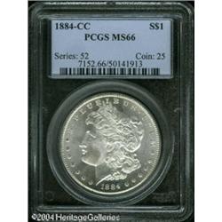 1884-CC S$1 MS66 PCGS. This gorgeous Morgan dollar <B>1884-CC S$1 MS66 PCGS.</B></I> This gorgeous Morgan dollar has a lot going for it: sharp strike, excellent bright luster, and freedom from noticeable bag marks. Essentially untoned, this piece should satisfy those collectors desiring white coins. <BR><BR><B>Important notice:</B> Heritage usually auctions material at the rate of 200-250 lots per hour. On some occasions eBay Live bid software or the Internet may not be able to keep up with the pace of the auction. We recommend placing a realistic absentee bid now as insurance to avoid disappointment. Occasionally the auctioneer may eliminate or reject an eBay Live bid, and the auctioneer may also reopen a lot after the close of the eBay live bidding (usually because we missed an audience bid), and may reject your bid even if it shows you as the winning bidder. By bidding via eBay Live, you agree that Heritage may award the lot to another bidder at its sole discretion under the circumstances described above or any other reasonable circumstances. Since eBay bids are not shown to us until we open the lot on the floor, we treat those bids just like floor bids. In most cases the floor responds before the eBay bid is presented to us, due to Internet lag time, so for consistency we have made it a policy that floor bids are always considered first over tie eBay live bids. Also please note that all Heritage lots purchased through eBay Live carry a 20% Buyer's Premium. Please make sure you read the Terms and Conditions before you bid. This lot is being auctioned in conjunction with a live floor auction by Heritage Galleries & Auctioneers. All final auction and invoice information will be supplied by Heritage Galleries & Auctioneers, and all other information should be considered preliminary. Lot:7472