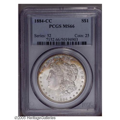 <B>1884-CC<S$1> MS66 PCGS.</B></I> Well struck and highly lustrous, with dazzling cartwheel luster in the fields and lovely burnt-orange and mint-green toning along the upper obverse border. The bright surfaces are exquisitely preserved.