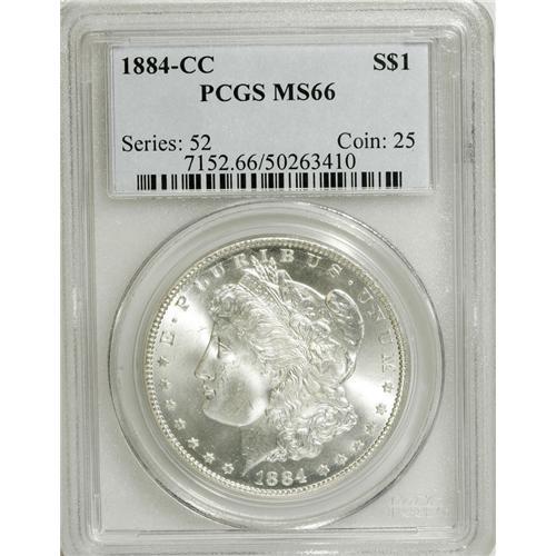 <B>1884-CC S$1 MS66 PCGS.</B></I> Well struck with dizzying cartwheel luster radiating from both sides, and entirely brilliant, snow-white surfaces. Carefully preserved with just a few wispy marks.<BR><BR><b>Shipping:</b> Coins & Currency (<a target="_blank" href="http://www.heritageauctions.com/common/shipping.php">view shipping information</a>)