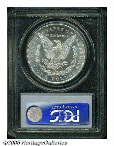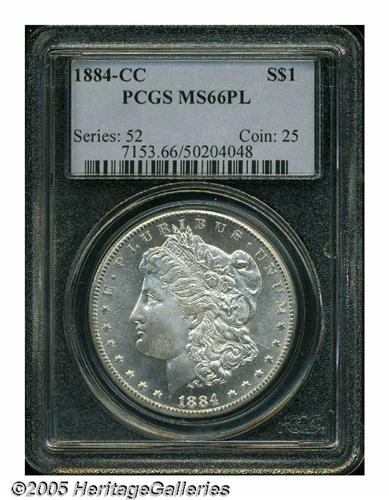 <B>1884-CC<S$1> MS66 Prooflike PCGS.</B></I> The relative scarcity of the 1884-CC dollar in MS66 Prooflike condition is evident from auction records, where it has made 23 appearances through the major houses over the past ten years, with only two specimens recording an MS67 grade, and none finer. Likewise, the PCGS and NGC population reports show a combined total of 122 specimens certified as MS66 Prooflike, with a mere six pieces graded higher. The present example is generally adequately struck, though the hair above Liberty's ear and the eagle's breast feathers are weak. Lustrous surfaces reveal just a touch of light tan patina on portions of the obverse and reverse motifs, and are well preserved.