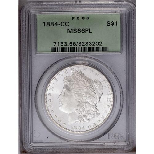 <B>1884-CC<img border='0' src='http://www.heritagecoins.com/images/star.gif' width=10 height=10>$1> MS66 Prooflike PCGS.</B></I> This highly lustrous and crisply struck Carson City dollar has undisturbed fields and good eye appeal. The 1884-CC is available in bagmarked Mint State, but becomes very scarce in such exceptional condition. Population: 88 in 66 Prooflike, 1 finer in Prooflike (2/06).