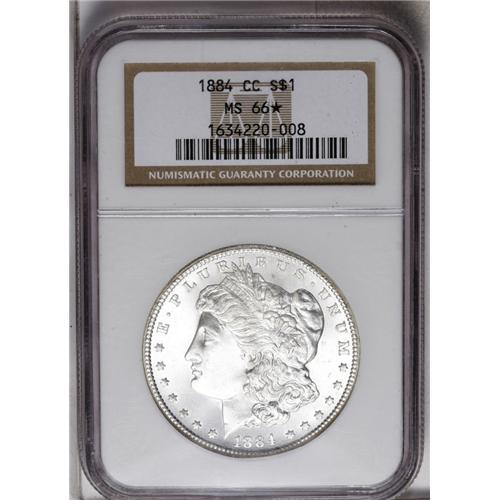 <B>1884-CC<img border='0' src='http://www.heritagecoins.com/images/star.gif' width=10 height=10>$1> MS66 <img border='0' src='http://www.heritagecoins.com/images/star.gif' width=10 height=10> NGC.</B></I> A brilliant and boldly struck Premium Gem with blazing cartwheel luster and clean surfaces. A simply outstanding survivor. NGC has certified just 11 pieces as 66 <img border='0' src='http://www.heritagecoins.com/images/star.gif' width=10 height=10> and has awarded the star to no finer examples (8/06).