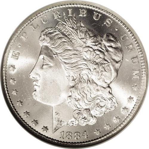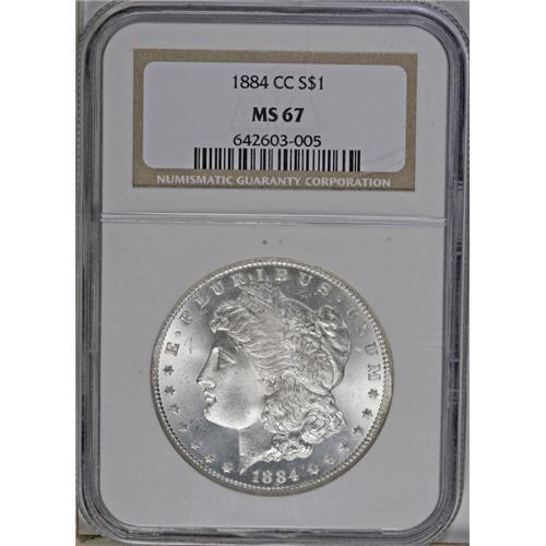 <B>1884-CC<img border='0' src='http://www.heritagecoins.com/images/star.gif' width=10 height=10>$1> MS67 NGC.</B></I> According to the Bowers silver dollar <I>Red Book,</B></I> President Chester A. Arthur is said in 1884 to have remarked concerning silver dollars: "Well, we got a mess of these things now. We made 185 million and only 40 million are out." Fortunately for collectors of today, most of the original mintage of this issue was stored for decades, to be released in the GSA sales of the 1970s. This piece offers superb quality, with smooth, fully brilliant surfaces. Each side has highly lustrous, frosty devices with satiny fields. The contrast provides exceptional eye appeal. Few can match it for quality. Census: 69 in 67, 0 finer (9/06).