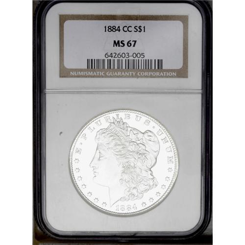 <B>1884-CC<img border='0' src='http://www.heritagecoins.com/images/star.gif' width=10 height=10>$1> MS67 NGC.</B></I> Superb quality with smooth and fully brilliant surfaces. Each side has highly lustrous and frosty devices with satiny fields. The contrast provides exceptional eye appeal. Very few can match this for quality. Census: 66 in 67, 0 finer (3/06). <BR><BR><B>Important notice:</B> Heritage usually auctions material at the rate of 200-250 lots per hour. On some occasions eBay Live bid software or the Internet may not be able to keep up with the pace of the auction. We recommend placing a realistic absentee bid now as insurance to avoid disappointment. Occasionally the auctioneer may eliminate or reject an eBay Live bid, and the auctioneer may also reopen a lot after the close of the eBay live bidding (usually because we missed an audience bid), and may reject your bid even if it shows you as the winning bidder. By bidding via eBay Live, you agree that Heritage may award the lot to another bidder at its sole discretion under the circumstances described above or any other reasonable circumstances. Since eBay bids are not shown to us until we open the lot on the floor, we treat those bids just like floor bids. In most cases the floor responds before the eBay bid is presented to us, due to Internet lag time, so for consistency we have made it a policy that floor bids are always considered first over tie eBay live bids. Also please note that all Heritage lots purchased through eBay Live carry a 20% Buyer's Premium. Please make sure you read the Terms and Conditions before you bid. This lot is being auctioned in conjunction with a live floor auction by Heritage Galleries & Auctioneers. All final auction and invoice information will be supplied by Heritage Galleries & Auctioneers, and all other information should be considered preliminary. Lot:3395 <BR><BR><B>Winning Notification and Billing:</B> After the FINAL session in this auction is complete, Heritage will send e-mail and snail mail invoices. This process normally takes several days. All final auction and invoice information will be supplied by Heritage Galleries & Auctioneers, and all other information should be considered preliminary. <BR><BR>This auction will be conducted on a live auction floor and over the Internet through eBay Live. If you choose to place an absentee bid, please take a moment to <font color='#0000ff'><u><a href='http://pages.ebay.com/liveauctions/help/before/laabsentee.html'>learn how eBay Live absentee bidding works</a></u></font><font color='#000000'>