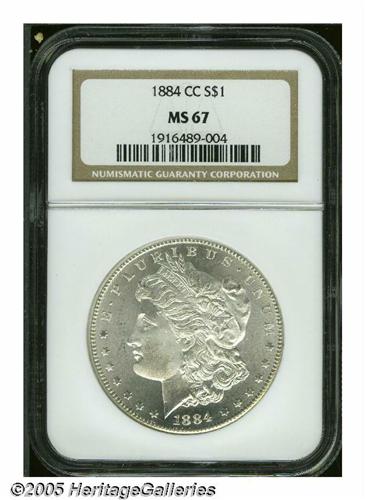 <B>1884-CC<S$1> MS67 NGC.</B></I> This is an exceptional example that was sharply struck, and retains nearly perfect surfaces. Both sides are brilliant with silvery-white luster. Tied for finest certified by NGC. Population: 54 in 67, 0 finer (6/05).