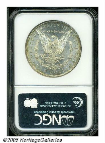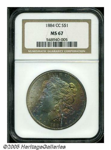 <B>1884-CC<S$1> MS67 NGC.</B></I> Wide swaths of rainbow iridescence blanket the obverse of this Superb, boldly struck example. Not only is this piece virtually unabraded, but its to-die-for color makes it an even more desirable Carson City Dollar. Population: 47 in 67, 0 finer (4/05).
