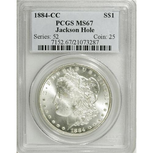 <B>1884-CC S$1 MS67 PCGS.</B></I> Ex: Jackson Hole. Like most examples of this date, it is most likely the case that this coin came from the 1970s GSA sale of Carson City Morgan dollars, although it is uncommonly nice and far superior to most of the pieces from that source. The surfaces of this Superb Gem are frosty and highly lustrous with complete cartwheels on each side. Population: 54 in 67, 3 finer (2/07).<BR><I>From The Jackson Hole Collection.</B></I><BR><BR><b>Shipping:</b> Coins & Currency (<a target="_blank" href="http://www.heritageauctions.com/common/shipping.php">view shipping information</a>)