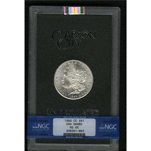 <B>1884-CC<img border='0' src='http://www.heritagecoins.com/images/star.gif' width=10 height=10>$1> Morgan Dollar MS65 NGC.</B></I> A brilliant and boldly struck Gem in its original GSA holder. Marks are appropriate for the grade, including faint roller marks on Liberty's cheek.