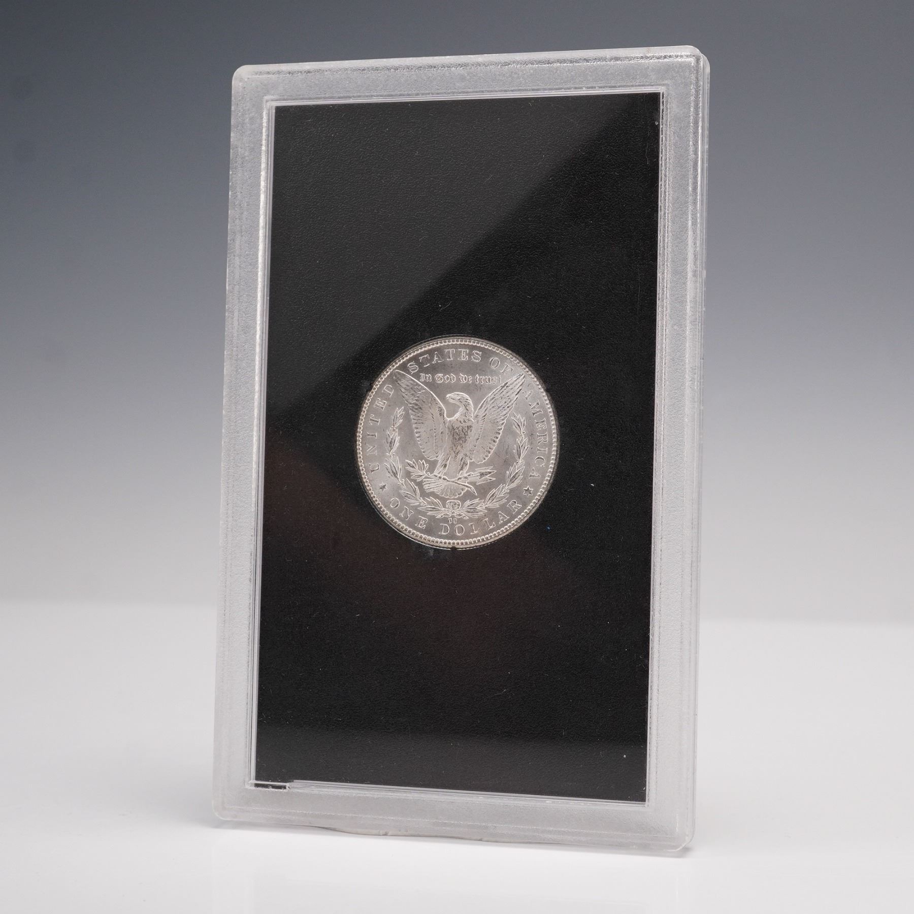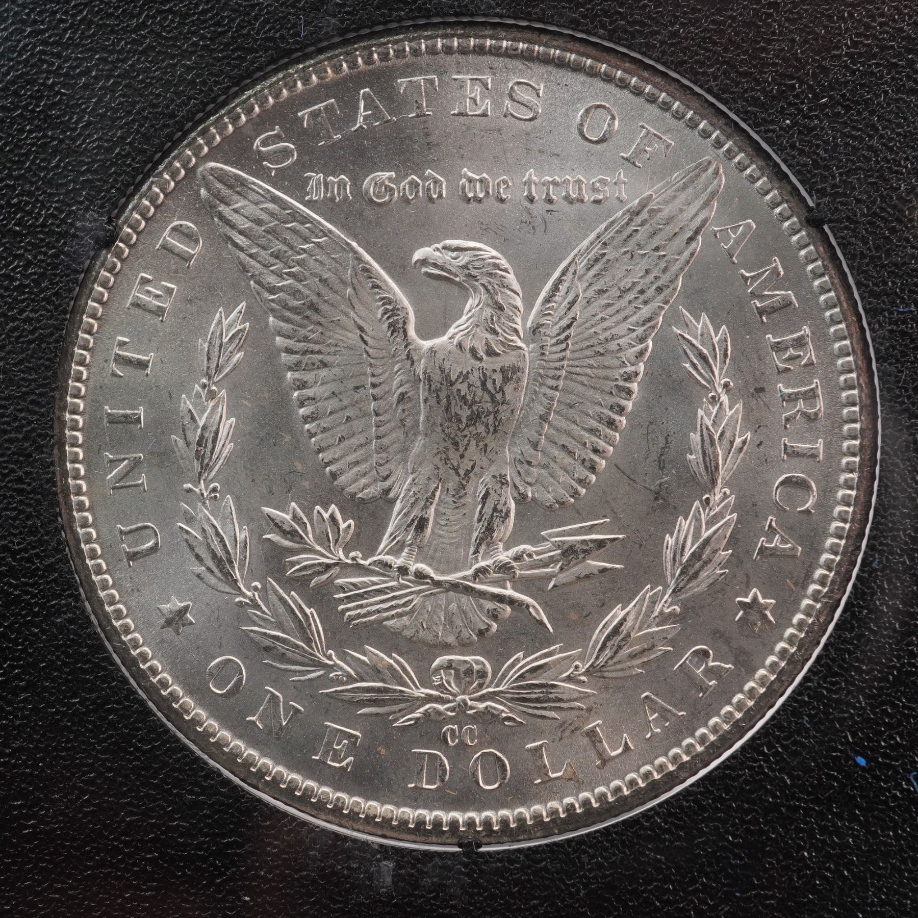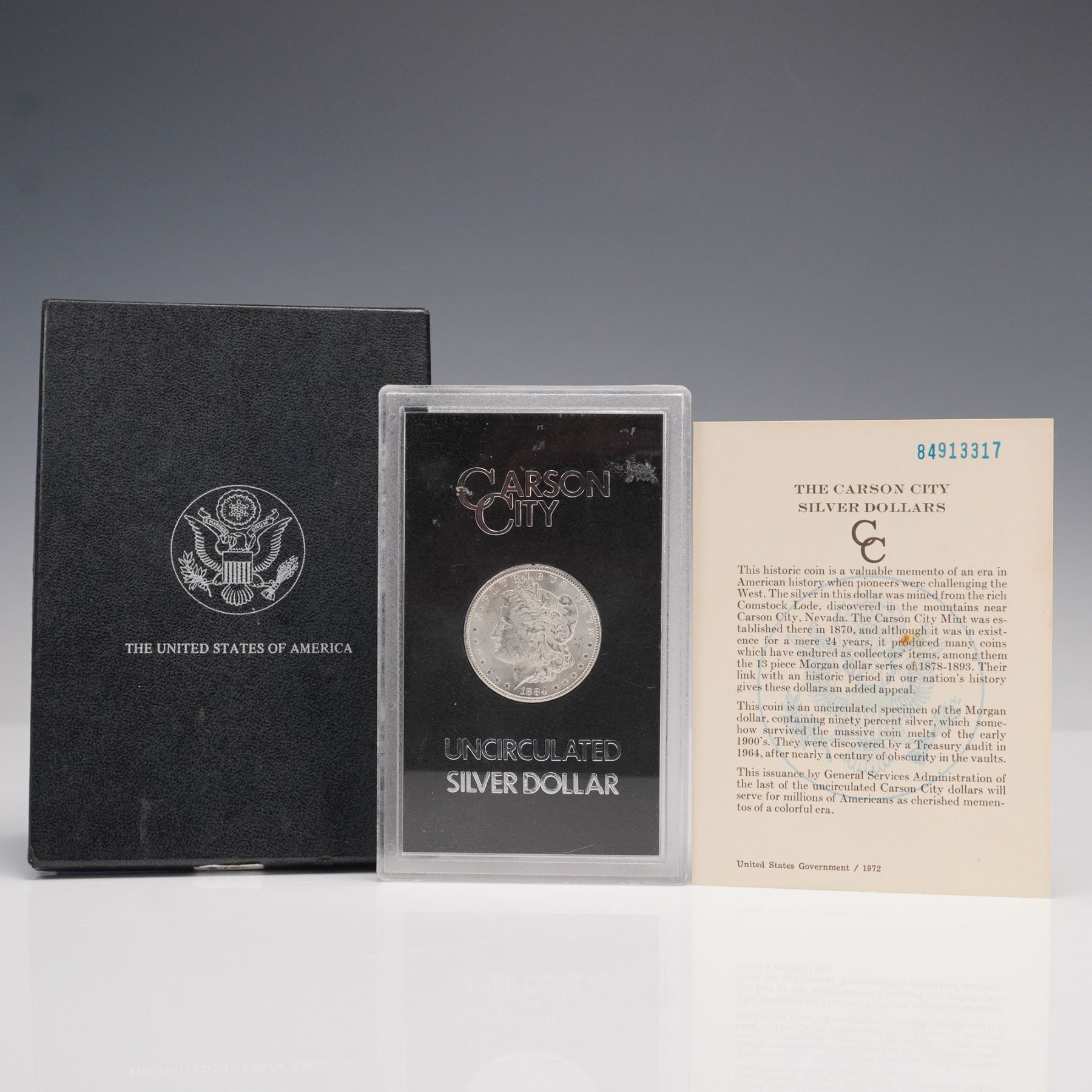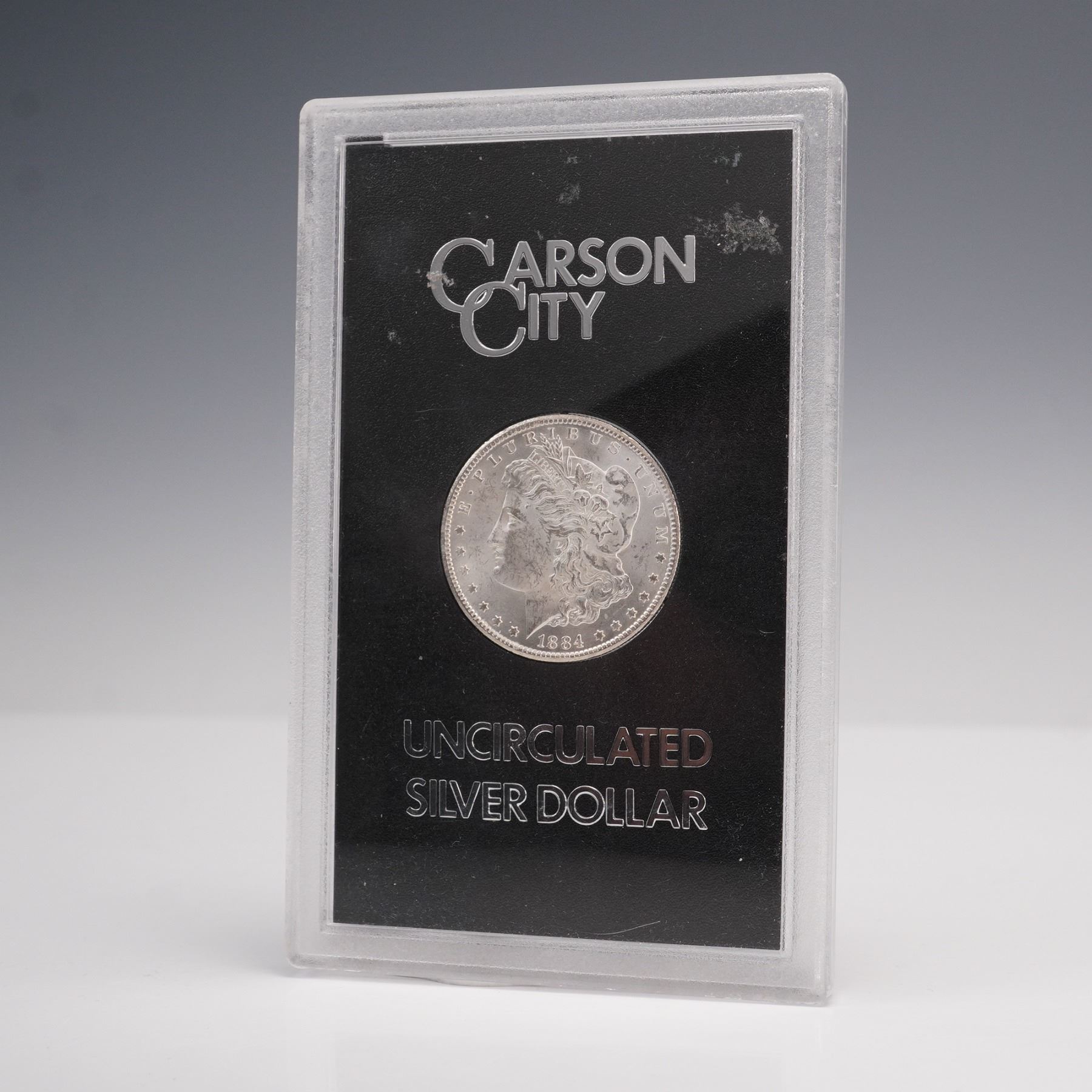 Uncirculated 1884 Morgan Silver Dollar minted at the Carson City Mint. The obverse features the left-facing profile of Lady Liberty wearing a Phrygian cap adorned with agricultural motifs, surrounded by thirteen stars, the motto E Pluribus Unum, and the date 1884. The reverse displays an American bald eagle clutching arrows and an olive branch, positioned within a laurel wreath. Above the eagle appears the motto In God We Trust, and along the perimeter are the inscriptions United States of America and One Dollar, with the "CC" mintmark located beneath the wreath, denoting the Carson City Mint. This coin is composed of 90% silver and 10% copper, and remains housed in its original General Services Administration (GSA) hard plastic holder marked "Carson City Uncirculated Silver Dollar." Accompanied by the original U.S. Government-issued black case and printed certificate card detailing the GSA hoard release. Box: 4.5"L x 0.5"W x 6.5"H. Slab: 3.5"L x 0.25"W x 5.5"H. Coin diameter: 38.1mm.