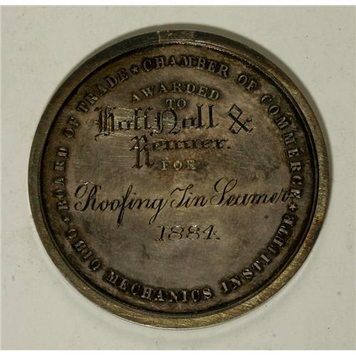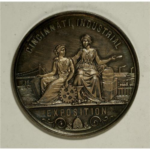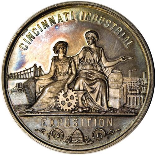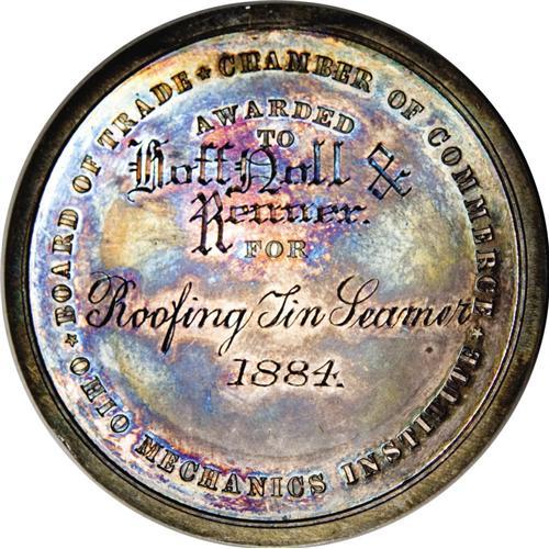 <B>1884 Cincinnati Industrial Exposition Silver Award Medal.</B></I> This is an uncertified XF45 silver medal with legend: Awarded by the Board of Trade / Chamber of Commerce / Ohio Mechanics Institute to Hoff Noll & Renner for Roofing Tin Seamer 1884. The piece was engraved by the famous Philadelphia engraver P.L. Krider. The medal measures approximately 44 mm with a weight of 34.4 gm. The medallion exhibits hairlines from an old cleaning, and the fields have rainbow toning accented by the original mirrorlike surfaces.<BR><BR><b>Shipping:</b> Coin/Currency (<a target="_blank" href="http://www.heritageauctions.com/common/shipping.php">view shipping information</a>)