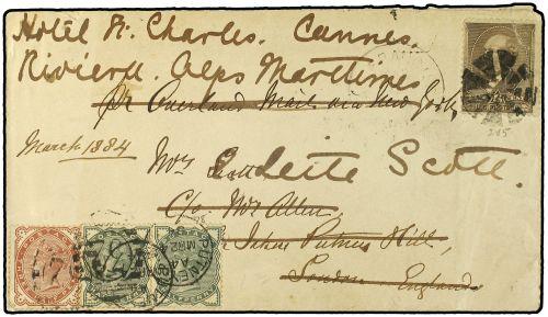 1884 Cover franked by 1882 Garfield 5 c. brown used from San Francisco to London. On arrival (March 24) readdressed to Cannes, France with 1883 ½d green (2) and 1 ½d venetian red tied by Putney/32 duplexes. Scarce and interesting cover. SG 164,167.