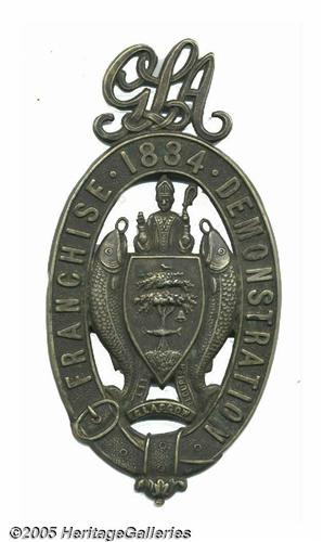 <B>1884 Franchise Demonstration Badge</B></I> This 4" x 2" metal badge relates to a major demonstration held in Glasgow on September 6, 1884 in support of expanding the rights to vote to a greater percentage of citizens. This included women as photographs exist that show posters with this date and women asking for the right to vote. This wonderful badge has the Glasgow Coat of Arms, and the GLA at the top stands for "Glasgow Liberal Association." An estimated 50,000 women and men marched in this demonstration as part of a country wide wave of marches and planned demonstrations asking for "Suffrage or the Franchise for All." Lot:261